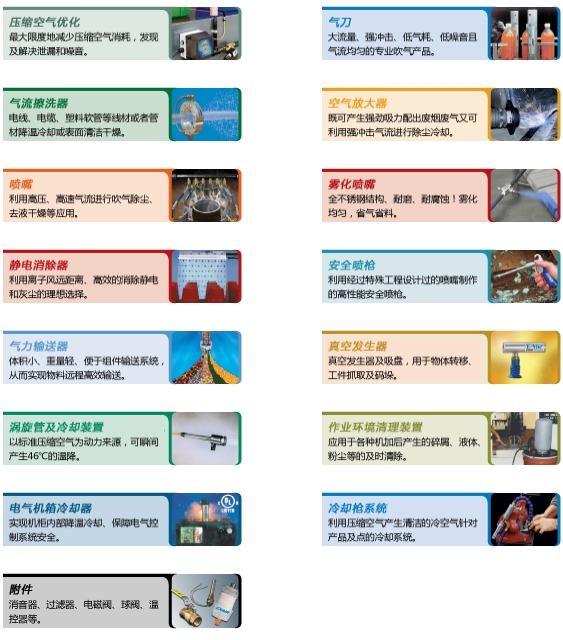 美國依愛(EXAIR)公司作為世界智能型壓縮空氣利用工具的鼻祖,34年來一直致力于開發和制造以壓縮空氣為動源的應用工具,主要包括超級氣刀、空氣增強器、渦旋管冷卻器、氣力輸送系統、電氣機箱冷卻器、氣刀式離子靜電消除器等等,可廣泛應用于自動化、電子電氣、食品飲料、制藥、包裝、汽車制造、塑膠、冶金、鋼鐵、化工、紡織、造紙、印刷、機械加工、儀器儀表等行業中,進行除塵去液、吹氣干燥、降溫冷卻、物料傳輸、消除靜電、環境清理等。