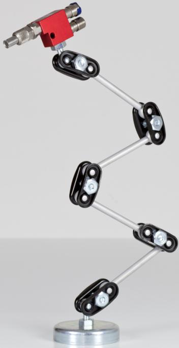 |  |  |  |  |  |   |  |  |  |       圖示為由一個HTRB050型噴頭和一根F13MH型三件式磁腳活結桿組成的噴頭組件。       堅固和穩定的支架可以將噴頭位置定位精確到一毫米以內。標配四個活動臂夾,三節活動臂及一個堅固的磁性底座。在不影響機床走刀的前提下,支架可牢固的吸附在機床內壁上(多為主軸),通過釋放每個活動臂夾上的內六角螺栓來輕微調整噴頭方向,達到各類加工所需的有效潤滑。 |